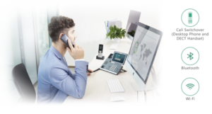 • Seamless switching of calls between the desktop phone and the cordless DECT handset